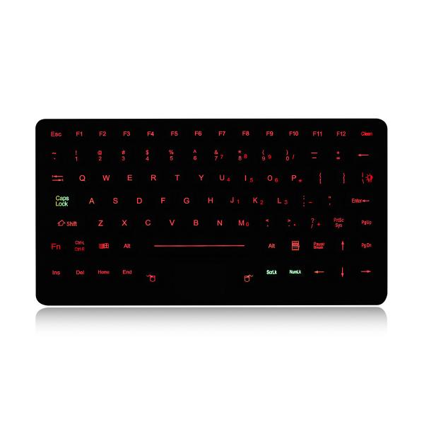 DESCRIPTION: 89 keys IP65 dynamic sealed and ruggedized industrial silicone rubber Hygienic keyboard with full keyboard functionalities with sealed and ruggedized tough touchpad for fast and accurate cursor position, with special industrial PCB with carbon-on-gold key switch technology with long stroke (1.50mm) with extremely good tactile feeling for fast and accurate data input without any noise, with durable coating & antimicrobial keyboard surface withstand to most chemicals and liquids under harsh environment, FN + Clean key to lock/disable the keyboard for easy cleaning without taking the keyboard from PC, top panel mounted. Adjustable industrial backlight included, military level.